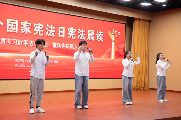 颁奖后,学生代表们进行《宪法伴我们成长》宪法主题歌曲演唱和《青春与宪法同行》宪法主题朗诵,唱出宪法与青年成长相伴的温暖,用饱含深情的话语讲述青春与宪法的不解之缘,传递出对宪法的尊崇与热爱,展现新时代青年学子对宪法精神的深刻理解和积极践行,更加筑牢了坚定不移走法治道路的信念。