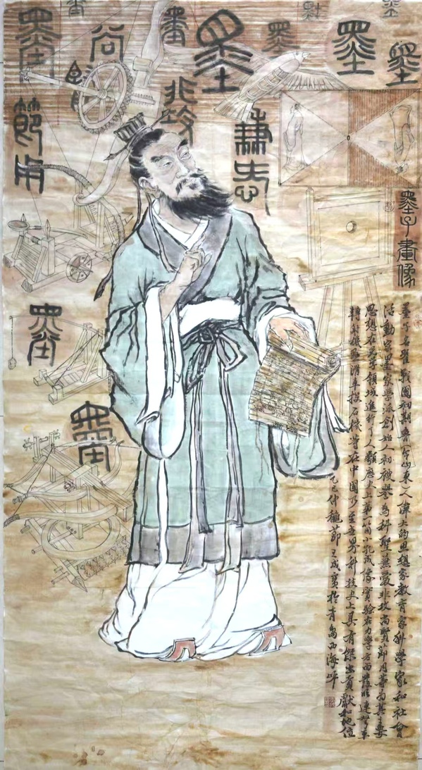 《墨子画像》以春秋战国时期著名科学家、思想家墨子为创作原型,通过国画技法,生动再现了墨子躬身实践、专注研究的形象。作品笔墨凝练,刻画细腻,既传达出墨子兼爱、非攻的哲学思想,也展现出其作为古代科学探索者的务实精神。评委评价该作品以艺术语言跨越时空,实现了历史人物与现代审美的融合