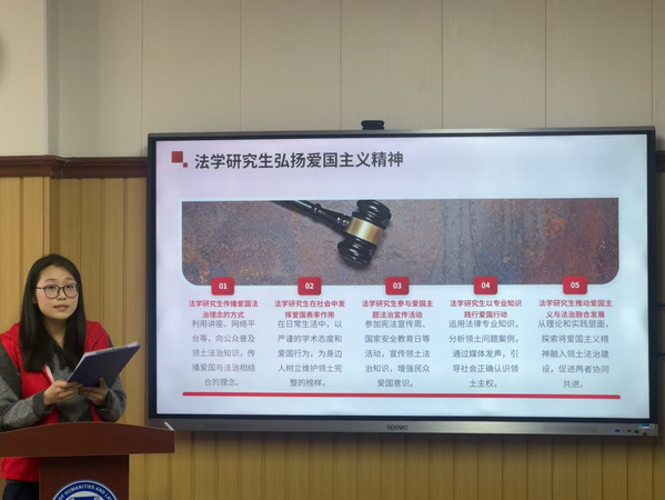 文法法律宣讲团成员王昊瑄以“宪法中的领土完整与爱国主义”为题,依次阐释了宪法对领土完整的规定、领土完整与国家发展的关联、爱国主义在维护领土完整中的体现及法学生的使命与担当,呼吁支部成员以专业知识践行爱国行动。