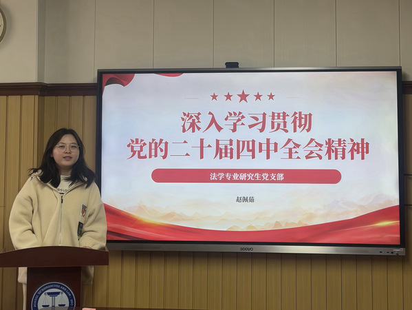 活动伊始,法学专业研究生党支部赵佩茹带领大家系统回顾了党的二十届四中全会召开背景,指出全会审议通过《中共中央关于制定国民经济和社会发展第十五个五年规划的建议》,强调“十五五”时期在基本实现社会主义现代化进程中“具有承前启后的重要地位”,并详细解读了“十五五”时期经济社会发展的主要目标,鼓励支部成员“在国家新蓝图中找到青年方位”,把个人成长融入国家发展。