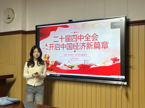 2025年12月18日,永利yl23411集团法律(非法学)2503班团支部于文理楼302教室召开学习党的二十届四中全会精神主题团日活动。本次活动以“学习全会精神,开启中国经济新篇章”为主题,通过全会解读、内容梳理、案例分析等形式,引导团支部成员深入领会全会精神实质,切实在思想与行动上于党中央保持高度一致。