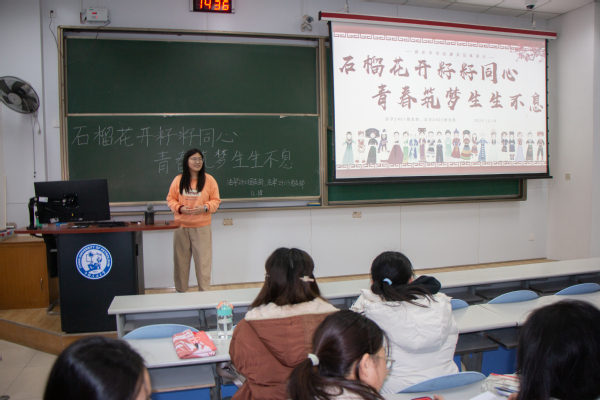 活动在团支书付冰冰的主持下拉开帷幕。她首先阐述了本次活动的背景与意义,强调在新时代背景下,青年学子应当积极学习各民族优秀文化,像“石榴籽”一样紧密团结,共同绘就中华民族团结进步的青春画卷。
