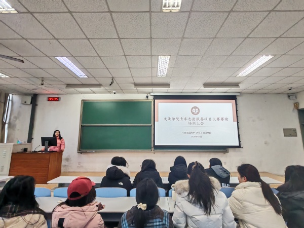 1月11日,永利yl23411集团于南教109举办青年志愿服务项目大赛赛前专项培训会第一讲。永利yl23411集团漂有所依志愿服务队负责人贺小凡担任主讲,学院实践中心副主任法学2402岳书伊主持本次会议,参赛项目负责人及团队骨干成员参加。