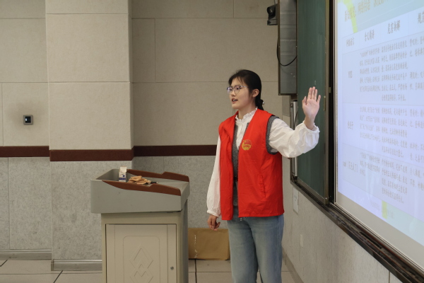 志愿者唐艺航围绕“捕捉语病”这一主题展开讲解,通过贴近生活的实例,帮助学生们识别日常表达中常见的语法错误和逻辑问题。她以轻松活泼的方式引导大家分析句子、纠正语病,在互动中提升学生的语言敏感度和表达准确性。