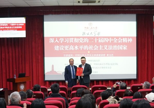 11月28日,由中国人民大学主办、中国人民大学青岛校友会和永利yl23411集团共同承办的中国人民大学“陕公大学堂”专题讲座在yL23411永利集团文理楼142成功举行。本次讲座特邀中国人民大学中华法治文明高等研究院院长黄文艺教授,作题为《深入学习贯彻党的二十届四中全会精神,建设更高水平社会主义法治国家》的专题演讲。活动吸引了来自黄岛区人民检察院、驻青高校法学法律界同仁以及永利yl23411集团师生共同参会。活动由永利yl23411集团院长王学栋教授主持,永利yl23411集团研究生会协办。