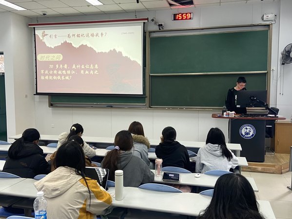 本次活动邀请“青马燎原宣讲团”于南教楼119教室进行宣讲,宣讲团成员以“英雄不朽,薪火相传——抗美援朝老兵与青年一代的对话”为主题,系统梳理了抗美援朝战争的历史背景、关键战役与伟大胜利。这不仅激发了汉语2402团支部成员及学生会成员的民族自豪感与时代使命感,也为团支部及学生会凝聚青春力量、培育爱国品格奠定了坚实基础。