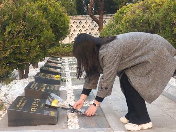 上午9时,全体成员抵达黄岛区烈士陵园陵园后,整齐列队、肃立默哀3分钟,在静默中缅怀先烈功绩,寄托无尽哀思。随后,学生代表叶尔森深情宣讲黄岛区本地烈士的英雄事迹,以朴实的语言讲述先烈们为国家独立、民族解放作出的牺牲与奉献,让在场成员深受触动。宣讲结束后,全体成员有序走到烈士纪念碑前,轻轻献上手中的菊花,并行注目礼,以最诚挚的方式表达对革命先烈的崇高敬意与深切缅怀。 “和平生活来之不易,正是无数先烈用鲜血换来的,我们定要铭记历史,珍惜当下。”音乐2401团支部成员吴佩佩感慨道。