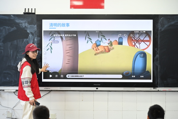 活动伊始,孙千惠向同学们介绍了本次活动的主题、流程,并引导大家有序参与活动。随后,宗璐以通俗易懂的语言为同学们宣讲“清明节的故事和习俗”。她详细介绍了介子推割肉救主、隐居绵山等经典故事,清晰梳理出清明节的历史脉络,让孩子们在经典传说中了解清明节的起源。随后,围绕扫墓、踏青、插柳、吃青团四大核心习俗,她通过插画趣味解读,向孩子们揭示了扫墓活动背后的深刻寓意。互动问答环节中,相关问题接连抛出,同学们踊跃举手、积极作答。稚嫩的回答声回荡在教室中,答对的同学收获精美小贴纸奖励,现场氛围热烈而温馨,在一问一答中将清明习俗传播入心入脑。