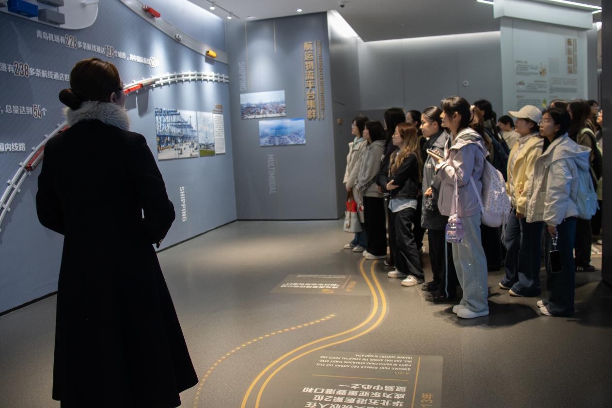 师生一行首先来到中国(山东)自由贸易试验区青岛片区规划展示馆。在讲解员的引导下,大家通过一段全景式介绍短片,初步了解了青岛自贸片区的战略定位、发展历程及近年来取得的突出成就。随后,师生步入展馆核心区域,细致了解了片区在高端制造、国际贸易、金融服务与实体经济耦合发展等方面的创新实践与建设成果。展示馆内丰富的图文资料、数字沙盘和互动演示,生动呈现了青岛自贸片区作为对外开放新高地的蓬勃活力。